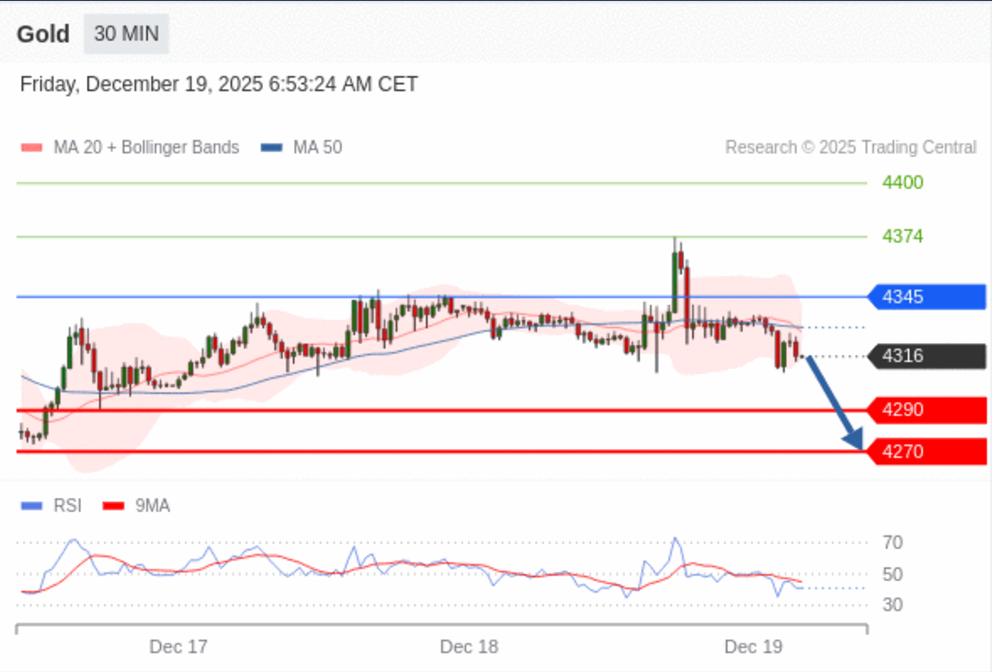 周四黄金小幅回档。美国11月CPI年增2.7%,明显低于市场预期的3.1%,通膨降温让黄金这个「抗通膨招牌」略显失色;不过,失业率同步上扬,替金价跌势踩了点煞车。现货黄金下跌0.2%,报每盎司4,330.39美元,自10月20日触及4,381.21美元历史新高后,持续在高档震荡;2月期金亦回落至4,364.5美元。AvaTrade爱华提供现货黄金交易平台,0佣金,低点差。